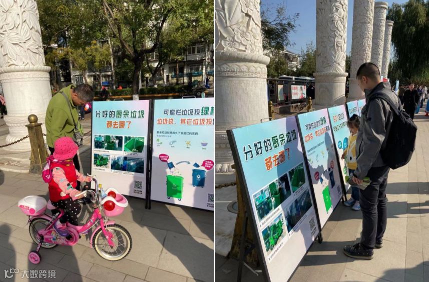 垃圾分类从娃娃抓起,参加活动的家长抓住这次机会,在宣传板前给孩子讲解垃圾分类常识。