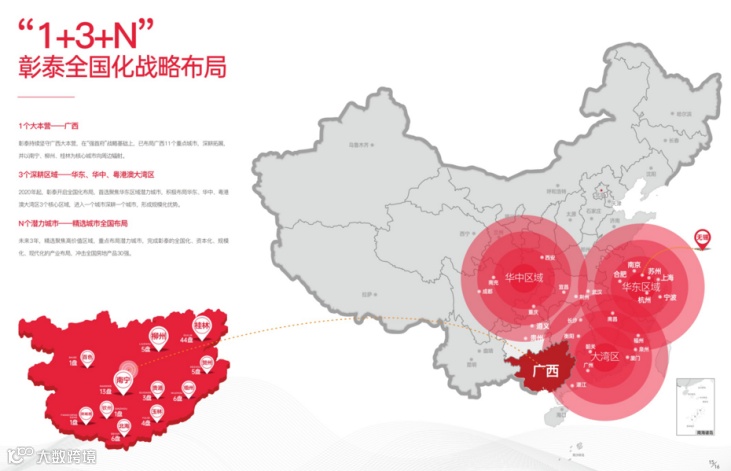 公开资料显示,截至2020年,彰泰集团已经进入桂林、南宁、柳州、梧州、贺州北海、玉林、防城港、白色、贵港、钦州等15城9县,已建在建项目近90余盘共计1800多万方,2019年土储位居广西房企榜首,占广西市场份额7.5%。