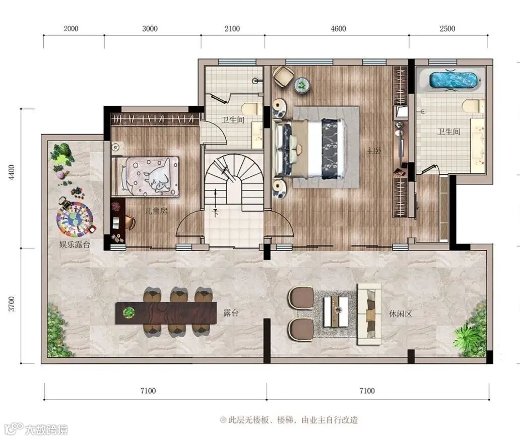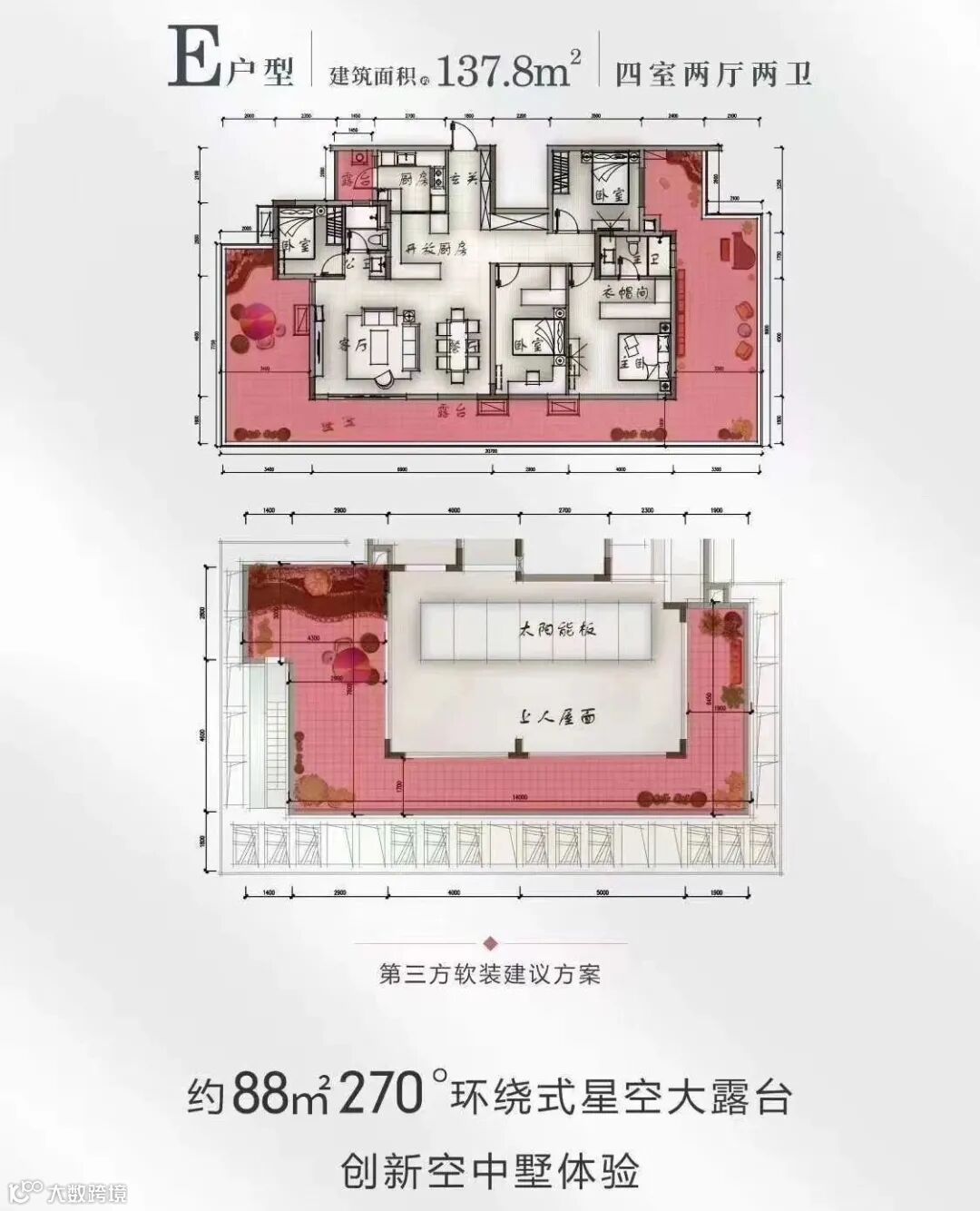 然后,surprise在不上人的屋顶,当然这张图是非官方的。我曾经带着朋友去看过,如果交房后,屋顶的空间可以用上,将拥有一个总面积达到79㎡,进深3.7米,面宽达到14.2米的大阳台。