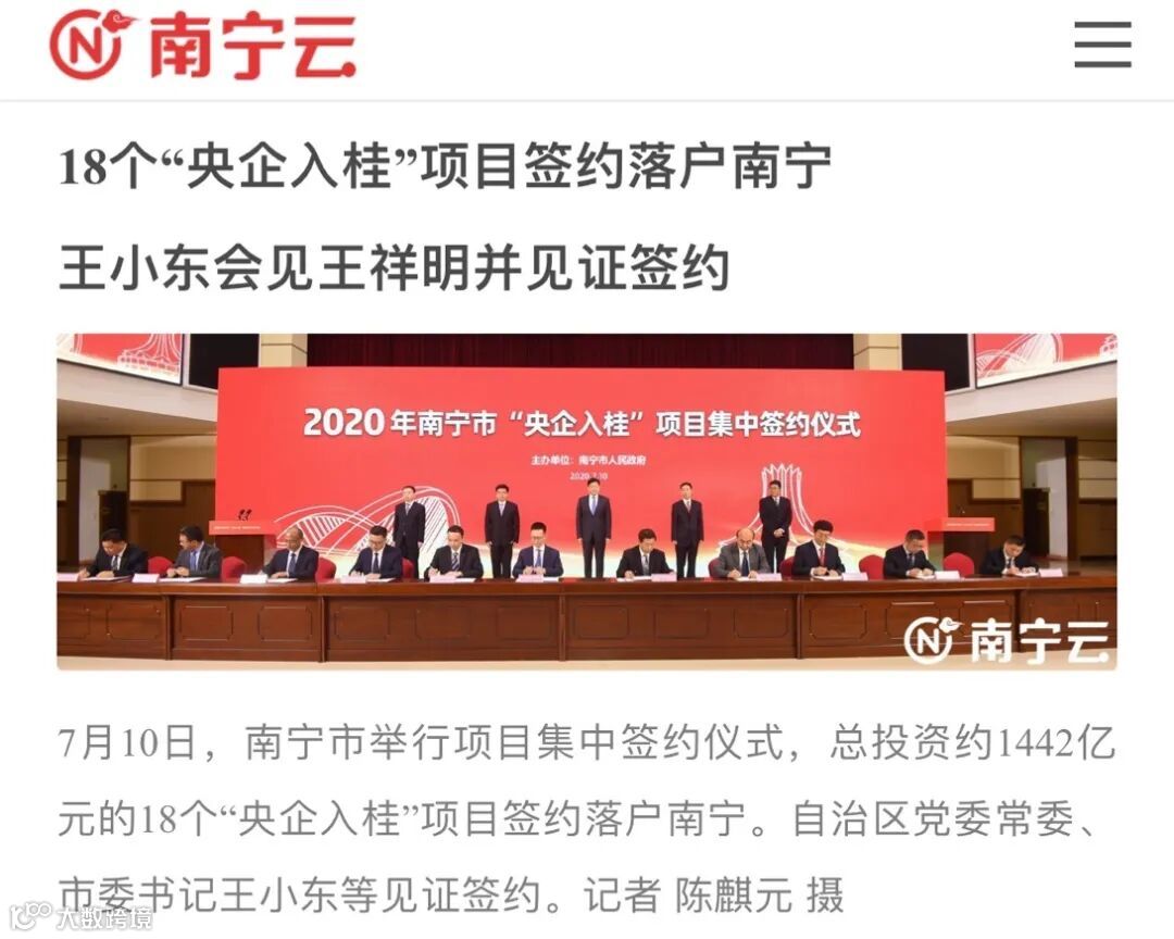 而今天晚上,南宁云等官媒报道了:南宁市举行项目集中签约仪式,总投资约1442亿元的18个“央企入桂”项目签约落户南宁。
