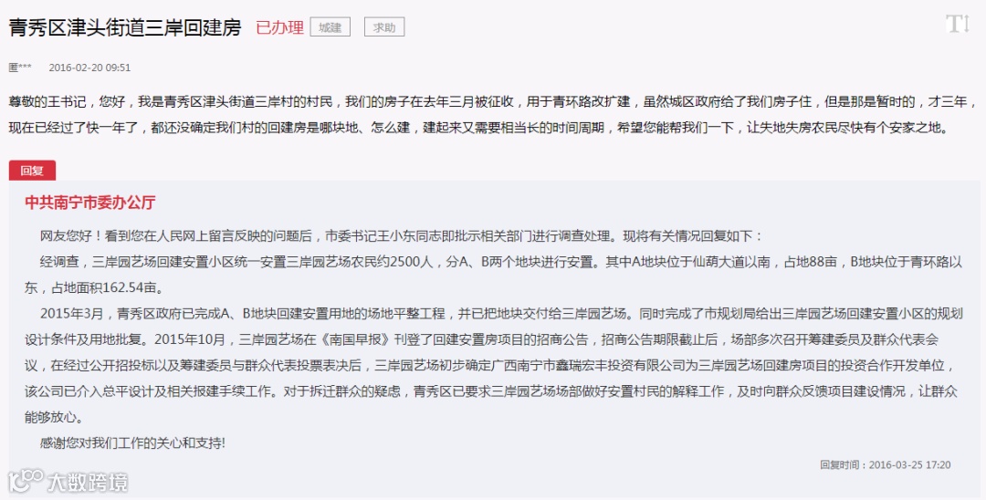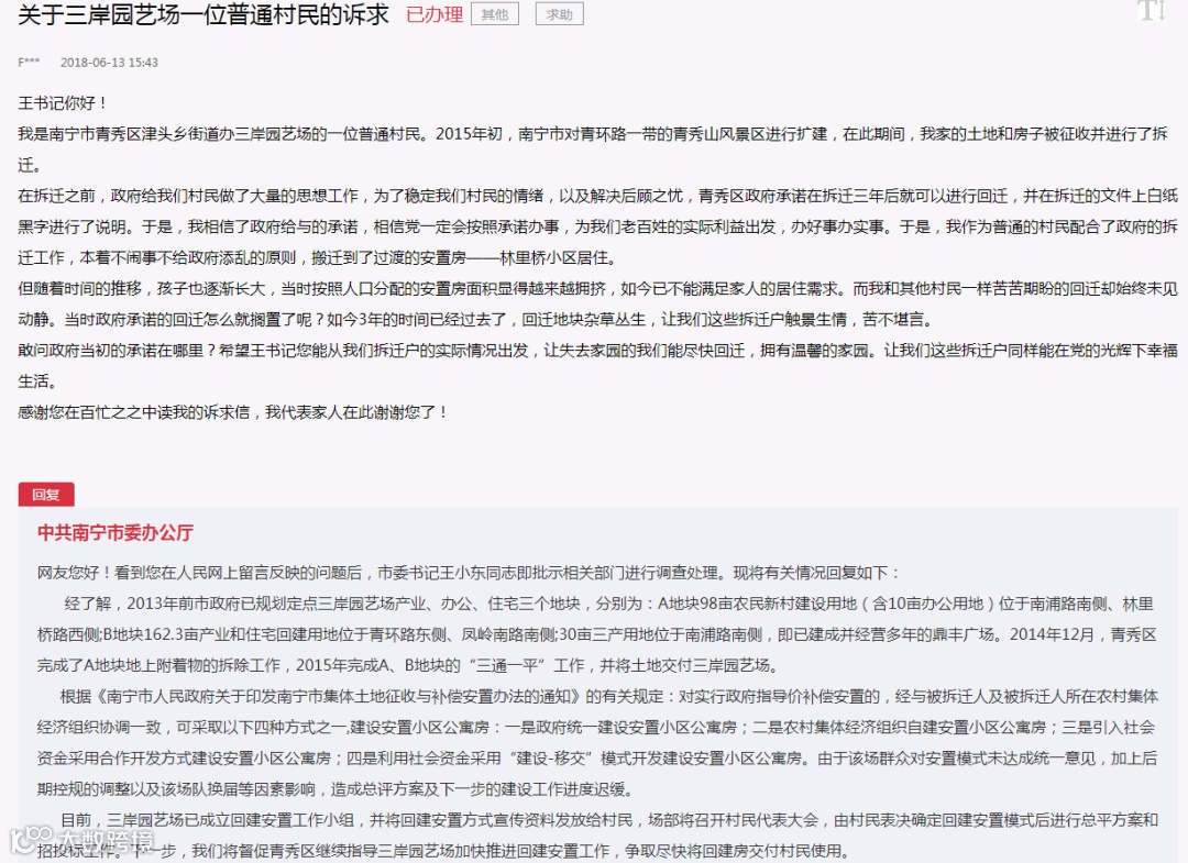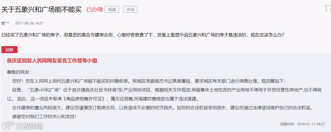 在人民网的领导留言板块,良庆区就回复过网友:合作建房的置业风险很大,建议谨慎签订购房合同。