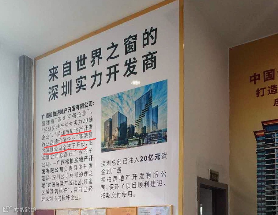 在招商中心、招商接待处,都有话术在提醒你“我们的开发商很厉害”,比如招商中心外的墙体上写着“深圳百强房地产企业控股公司倾情奉献”,室内墙上写着“深证市房地产开发行业品牌价值企业”等荣誉的“深圳公司全资子开设”(不是槽哥打错,他们的介绍里就是这么写的),但就是不告诉你这家公司是谁。