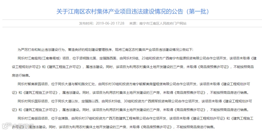 江南区政府此前也做过“关于江南区农村集体产业项目违法建设情况的公告”,提醒市民,三产房不能按照商品房进行销售。