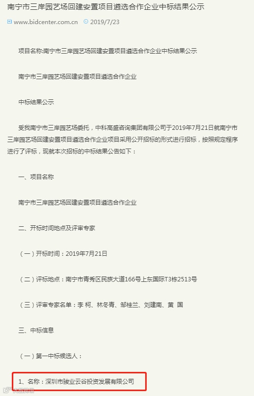 2019年7月21日,“南宁市三岸园艺场回建安置项目遴选合作企业中标结果公示”显示,深圳市骏业云谷投资发展有限公司为第一中标候选人。