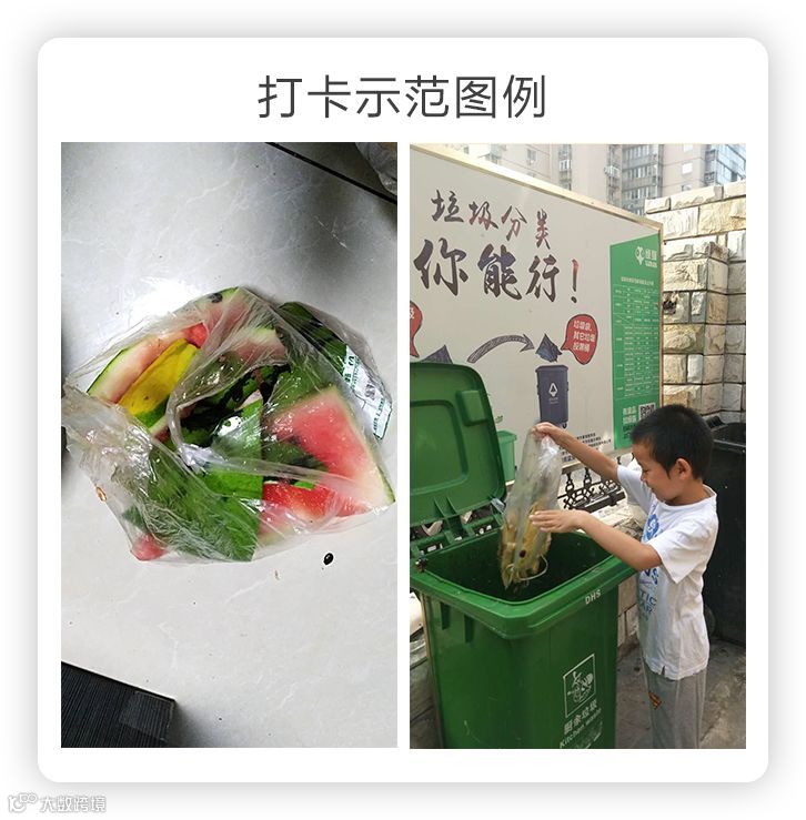 已分好的厨余垃圾照片、向绿桶倒厨余垃圾照片(厨余垃圾要裸投哦)以上两种照片上传任意一种,视为打卡合格。绿猫有打卡示范图例哦。