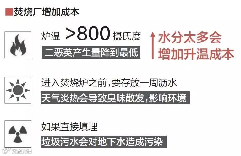 这位工作人员解释说,垃圾焚烧炉的炉温要达到800 摄氏度以上,如果水分太多,要更卖力地焚烧才能达到这 个温度。另外,如果填埋厨余垃圾,其中的水分也可能对 地下水造成污染。
