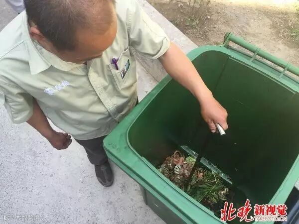 昨天中午,记者来到位于花市北里西区6号楼 的8号桶站,监督员庄师傅正好前来测 量。打开“厨余”绿桶,里面大多是菜叶 果皮,庄师傅用工具简单翻了翻,发现 了一个塑料袋,麻利地夹起扔进了旁边 的黑桶,“今天误投的比较少。”然后,他 拿着一根标着刻度的铁棍探进垃圾桶, 厨余垃圾的表面刚好没过第四个格 子。“一开始的时候,这桶里的垃圾连第 一个格子都没到呢。”
