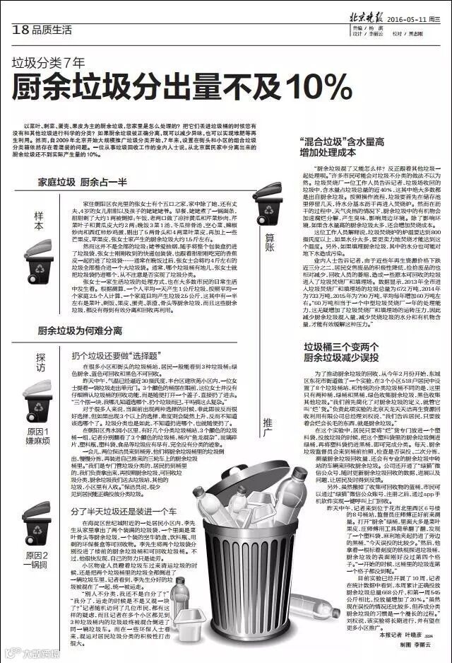 然而,自2009年北京开始大规模推广垃圾分类开始, 7年来,设置在街头和小区的组合垃圾 分类箱依然存在着混装的问题。一位从事垃圾回收工作的业内人士说,从北京居民家中分离出来的 厨余垃圾还不到实际产生量的10%。