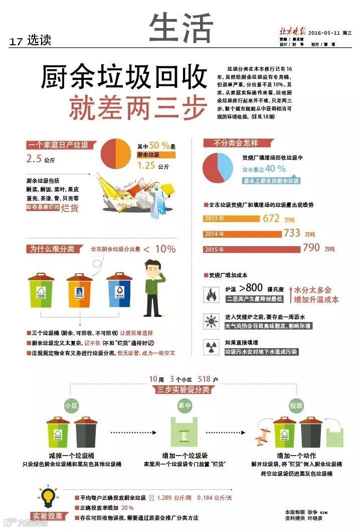 垃圾分类在本市推行已有 16年, 虽然给厨余垃圾设有专用桶,但混装严重,分出量不及 10%。 其实, 从家庭实际操作来看, 回收厨余垃圾推行起来并不难, 只差两三步, 整个城市就能从中获得相当可观的环境收益。
