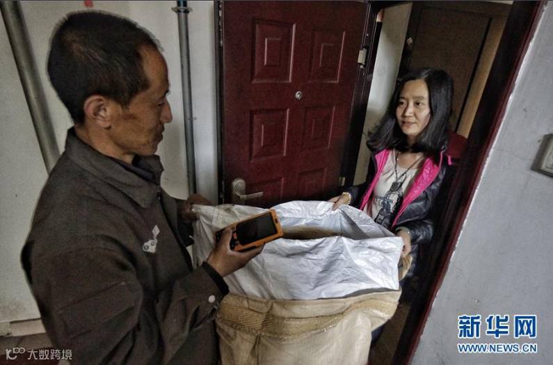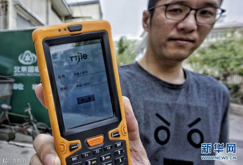 4月13日,天天洁再生资源的员工展示垃圾回收员携带的垃圾回收预约移动终端。