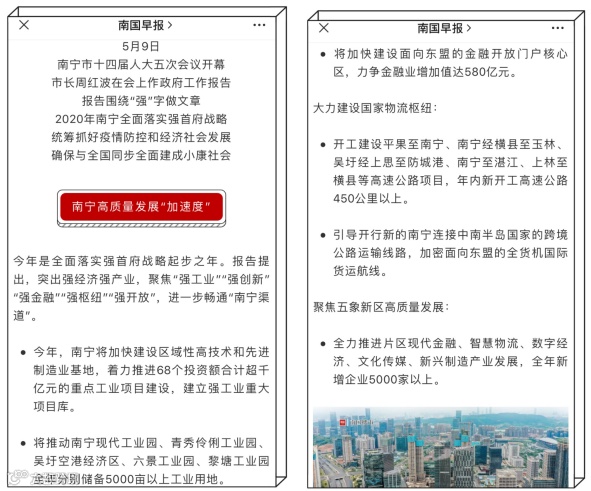 举全区之力“建设五象新区、再造一个新南宁”。2020年五象新区开发建设15年,已进入高质量发展阶段。之前五象新区的印象是“缺产业”,今年两会提出“新增5000+家企业”,无疑将会加速五象新区的成型和发展。