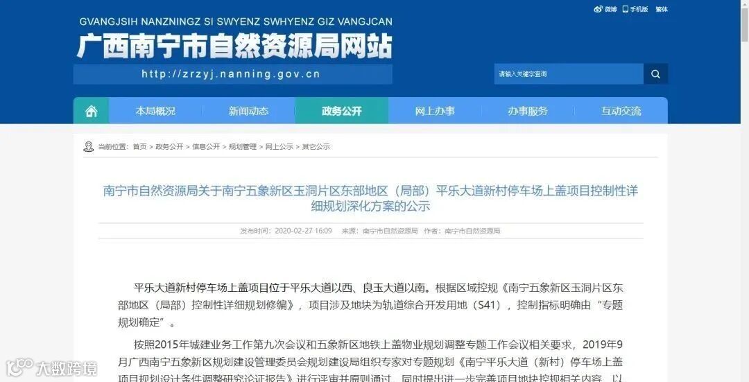 2月27日,南宁市自然资源局发布一则《关于南宁五象新区玉洞片区东部地区(局部)平乐大道新村停车场上盖项目控制性详细规划深化方案的公示》。