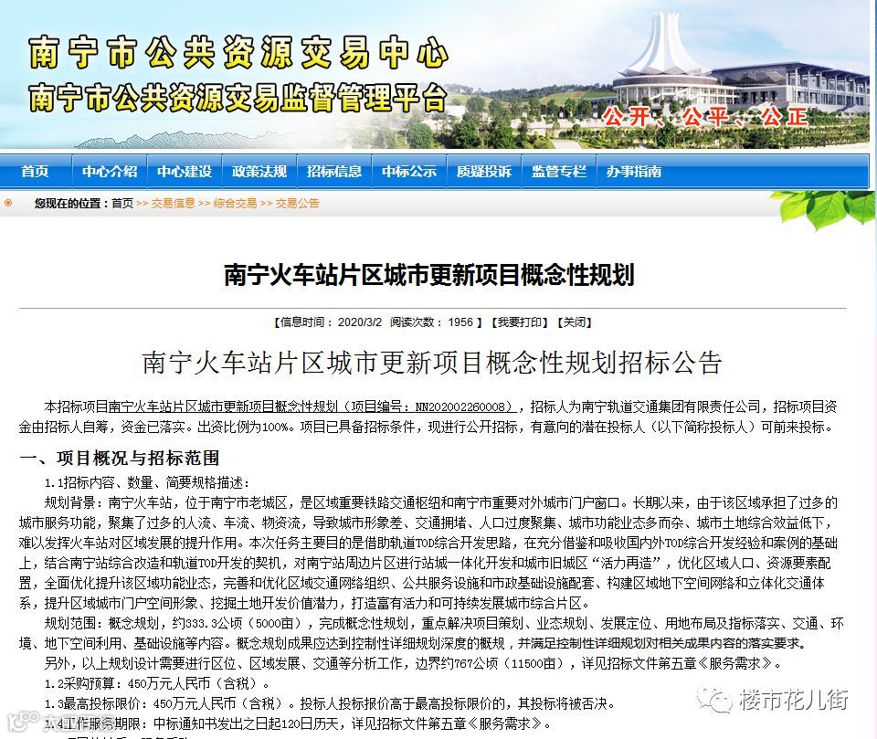 3月2日,南宁市公共资源交易中心发布《南宁火车站片区城市更新项目概念性规划招标公告》,将对南宁火车站进行新规划,规划范围333.3公顷(5000亩),并借助轨道TOD综合开发思路,把南宁火车站片区打造富有活力和可持续发展城市综合片区。