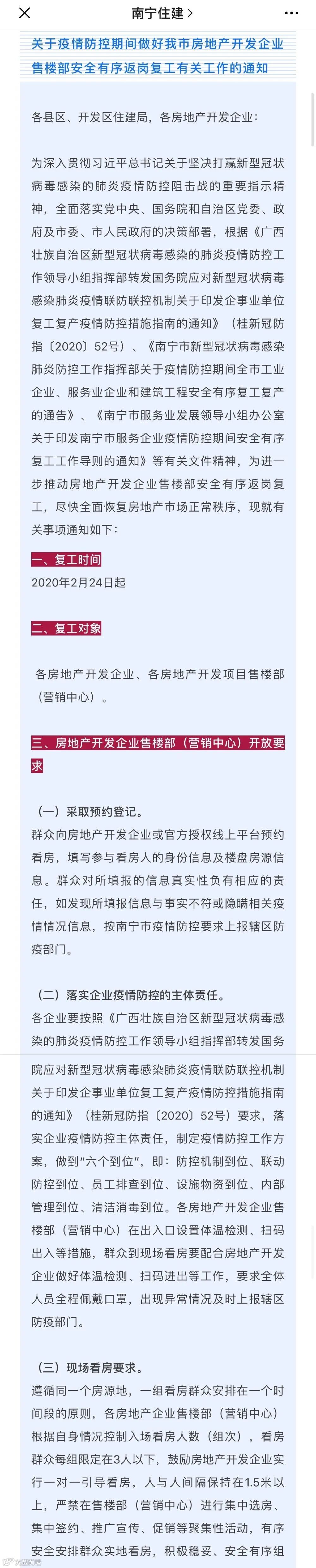 南宁市住房和城乡建设局发布《关于疫情防控期间做好南宁市房地产开发企业售楼部安全有序返岗复工有关工作的通知》。(通知原文和文件二维码直接拉到底部)