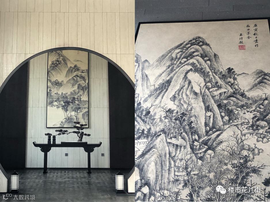 建发央玺售楼部从左边入口的《丛林曲调图》到内厅的《山楼客话图》,莫不是建发是想借着王时敏的画,体现同样“擅山水”的中式风?