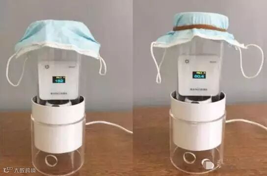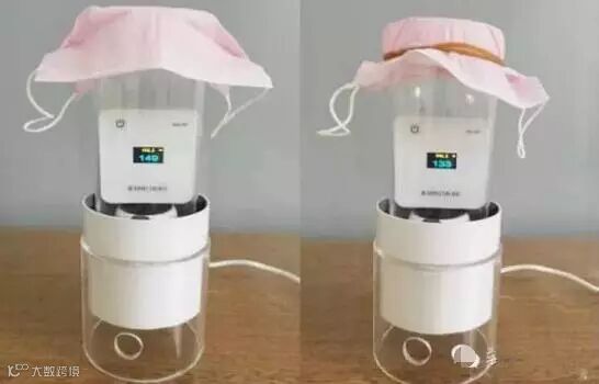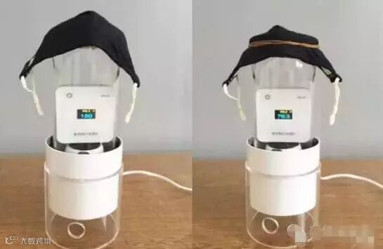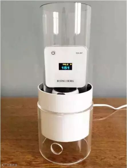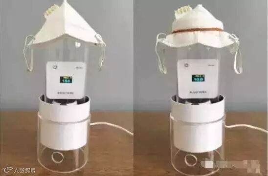 在一个约30平方米的密闭房间内,点燃香烟,模拟PM2.5高浓度环境。测得室内PM2.5原始值为50μg/m3,点燃1支香烟,室内PM2.5数值升至151μg/m3;将6款口罩用橡皮筋依次罩到风机口上,30秒后观察PM2.5数值变化情况。