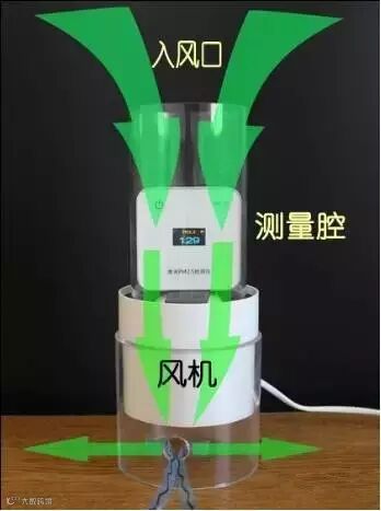 通电后,风机转动时带动气体向下流动,将口罩套在入风口,在风机的作用下,气体透过口罩从入风口进入测量腔中,分别测量通电前PM2.5浓度和口罩过滤后的PM2.5浓度。
