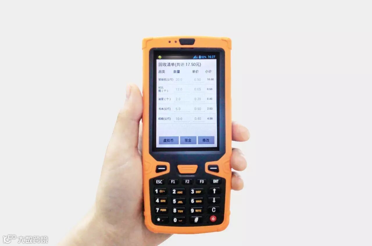 我们的回收员用电子秤称重后只需将数量录入设备,就会自动生成回收结算清单。