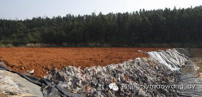 在接近山顶的山谷尽头,是架桥乡覃家溶村杨家湾组地界,有几亩地被一人高的铁网围住,周边也修筑了水泥围堰。在入口处,有一个创元铝业(晟通集团常德产业园)设置的警示牌,写有:有毒危险废物。里面填埋的是电解槽大修产生的有毒危险固体废料,可以看到水泥围堰内铺设了厚厚的黑色防渗膜,一些固体废料暴露在 外面,距离20多米可以闻到一股呛鼻子异味。