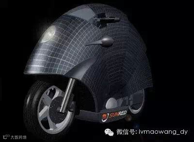红太阳“蜗牛”摩托车,圆壳造型增加太阳能板面积,车停止时,太阳能板还可以展开,表面面积将增加至25平方米。