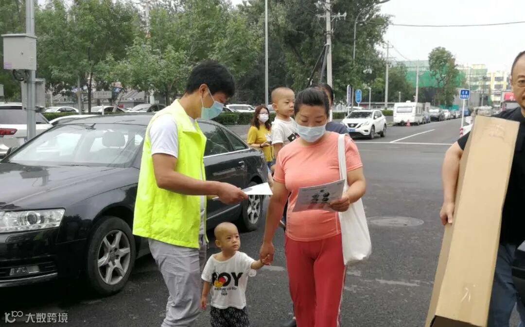 绿猫宣传员在社区卡口向居民发放垃圾分类宣传材料,为其