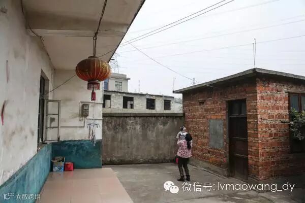图:村民抱着孩子在院子里,不远处就是冒着烟的大烟囱