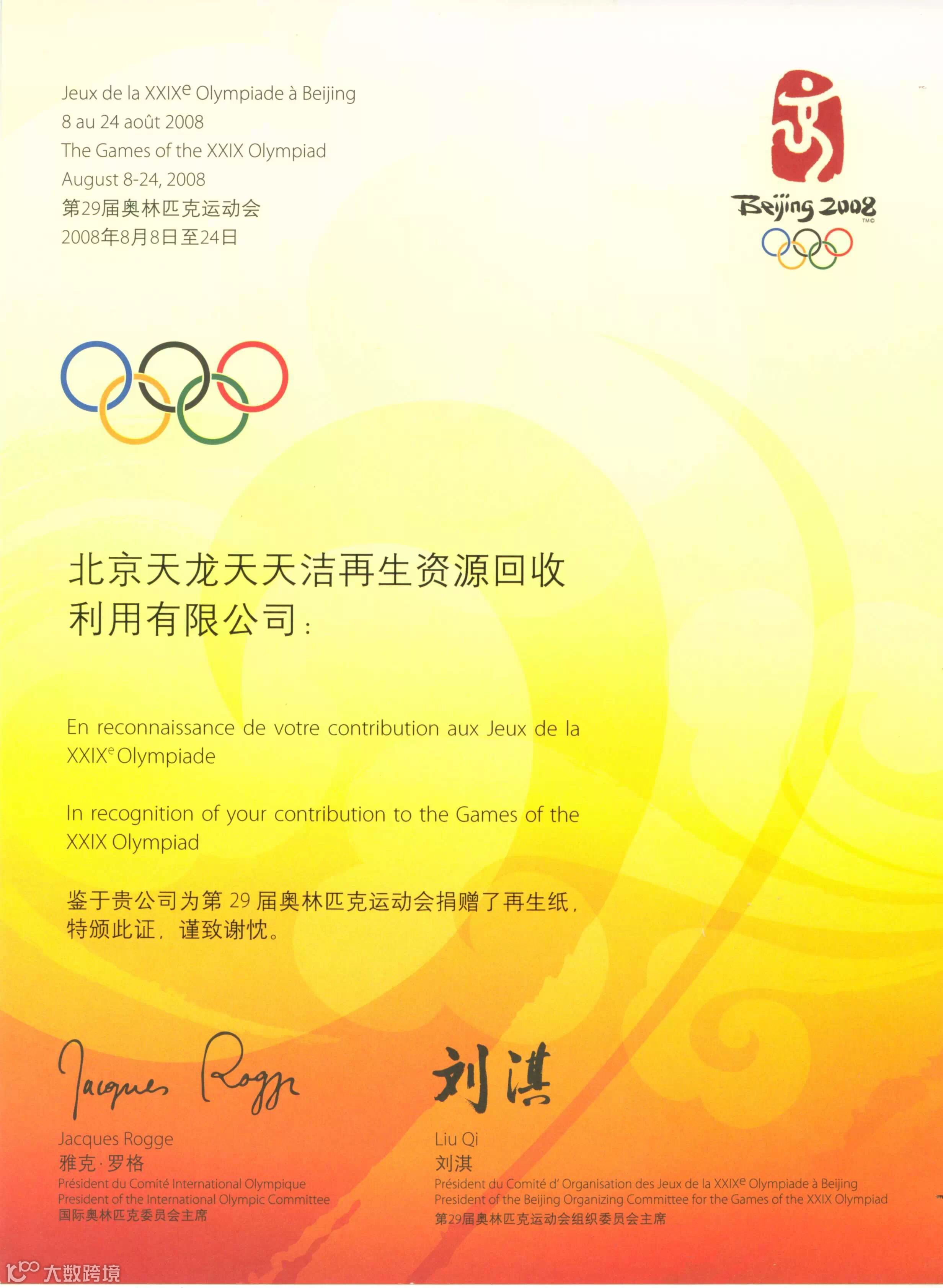 6. 2008年7月奥运会采用“天天洁”牌再生复印纸,成为奥运会唯一使用再生纸产品。