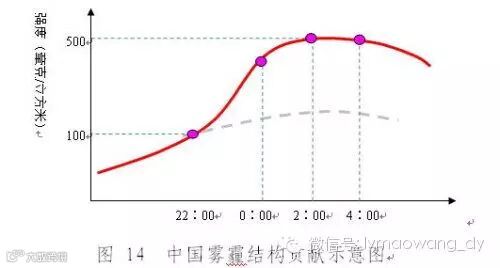 图14虚线为假设传统雾霾浓度发展趋势,实线为微生物、水分及氨氮作用下雾霾浓度发展趋势线。冬春季节夜间气象条件有利于水份蒸腾凝结和微生物繁殖,尤其冷空气南下造成空气水份加速凝结,极易形成严重雾霾;白天水分蒸腾作用随大气湿度增大而减弱,温度上升也使水分凝结作用减弱,使水分和氨氮减少,微生物活性减弱,雾霾强度下降。