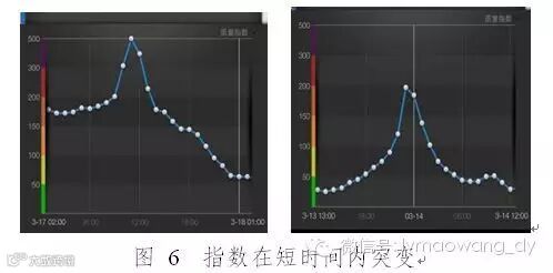 附着在气溶胶颗粒上的微生物在适宜条件下迅速繁殖,使气溶胶体积迅速增大,最终形成雾霾。如常温常压下,气溶胶颗粒只有0.1微米,但随微生物迅速繁殖,体积可迅速增长到2.5微米、5微米,甚至10微米。图6显示雾霾指数突变,左图最高点在中午12∶00附近;右图最高点在凌晨00∶00附近。按传统解释,指数高点应有污染突发性事故发生,但事实上并没有,这只能用微生物快速分裂解释。