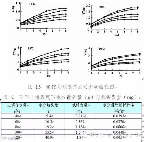 笔者实验在低温高效热泵型蒸馏装置中进行,对土壤中提取的水在43℃进行真空蒸馏。疾控中心对蒸馏水成份进行鉴定发现,蒸馏水消除原水中矿物质和重金属等物质,而氨氮等富营养物含量较高。这为前面论述提供有力支撑。研究表明,土壤含水量80克/千克,土壤水分散失引起氨挥发量最高 ,如表2所示。图13显示碳铵处理氨挥发动力学曲线。