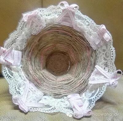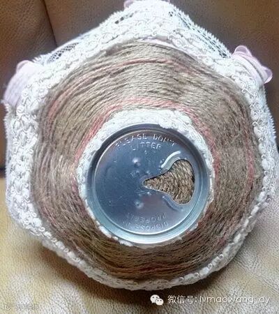 2.麻绳从底部开始缠绕易拉罐,我用了两种颜色麻绳。盘子顶部装饰丝带,背部以及底部也要装饰。