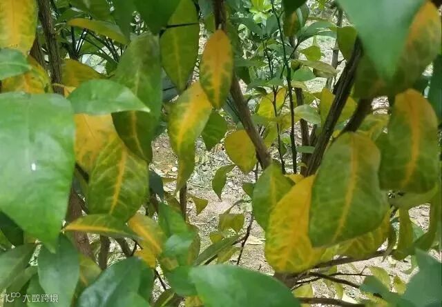 缺镁的柑橘从果实膨大到果皮着色表现出明显症状,挂果越多的树缺镁越严重。缺镁严重时,叶片全部黄化,甚至掉落,严重影响产量及果实质量。