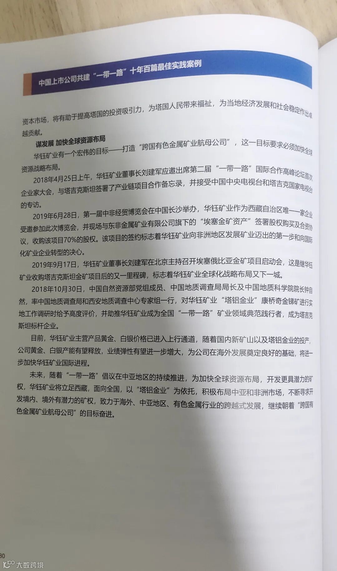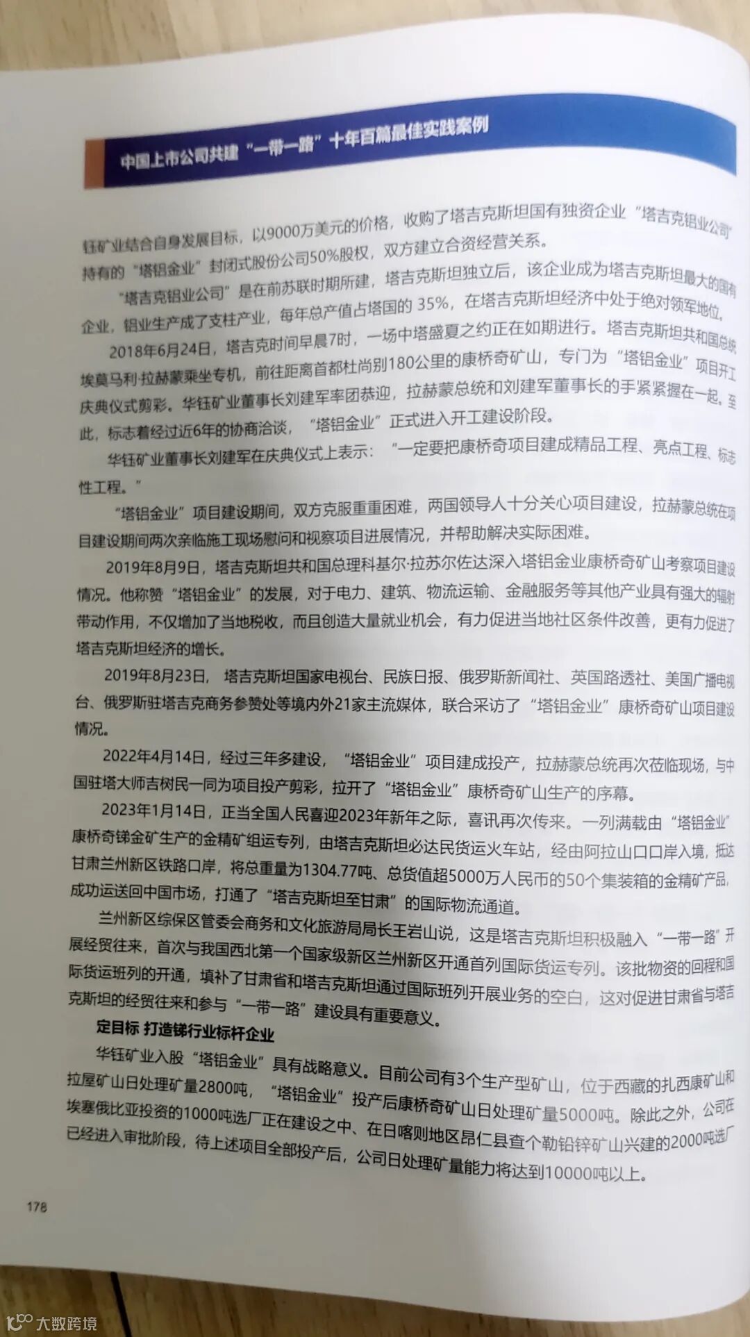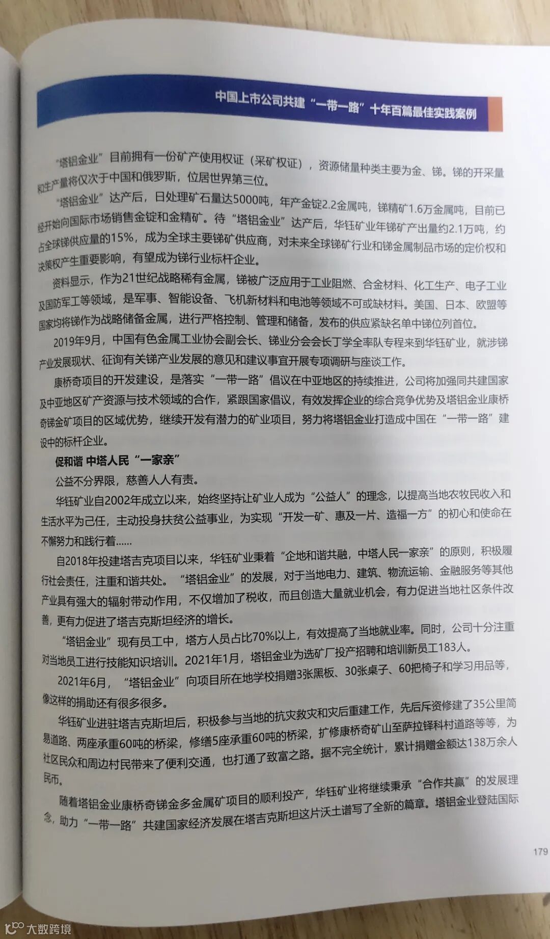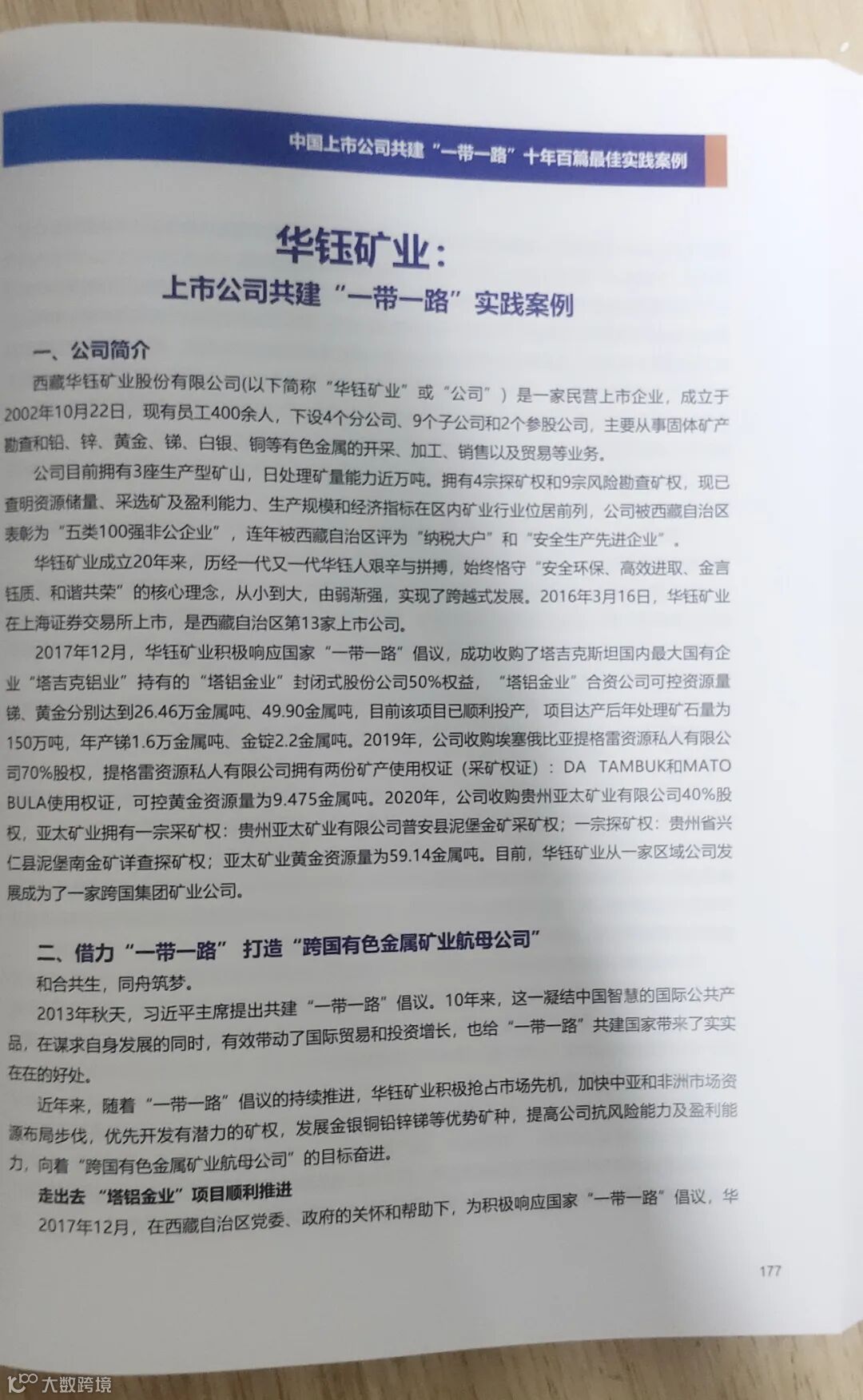 2023年7月和8月,公司董事会相继收到西藏证券业协会和中国上市公司协会关于“上市公司助力乡村振兴”和“上市公司共建一带一路”为主题的实践案例征文通知。接通知后,按照公司安排,笔者先后撰写的两个主题实践案例文章均通过公司董事会和西藏证券业协会的审核,并报送至中国上市公司协会参评。在继去年11月《华钰矿业:精准扶贫实现“输血造血”》成功入选《中国上市公司助力乡村振兴最佳案例》后,《华钰矿业:借力“一带一路”打造跨国有色金属矿业航母公司》又于近日成功入选《中国上市公司共建“一带一路”十年百篇最佳实践案例》,并入编《中国上市公司共建“一带一路”白皮书2023》。在这次主题案例评选活动中,华钰矿业也成为中国上市公司协会在西藏4家上市公司征文中,唯一两个主题同时获奖并入编案例的单位。