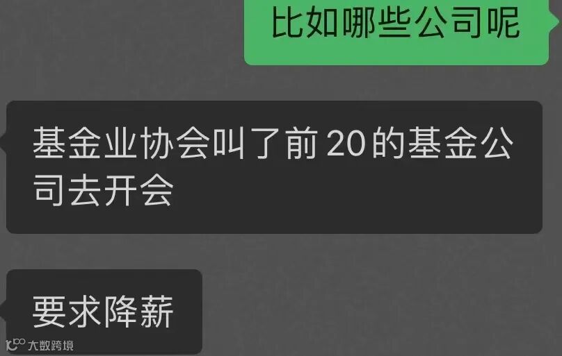 这一事件的爆出,金融行业将可能再次受到降薪的影响,以一人之力,推动行业的再次降薪。有网友曝出,基金协会已经叫了前二十的基金公司去开会,要求降薪。