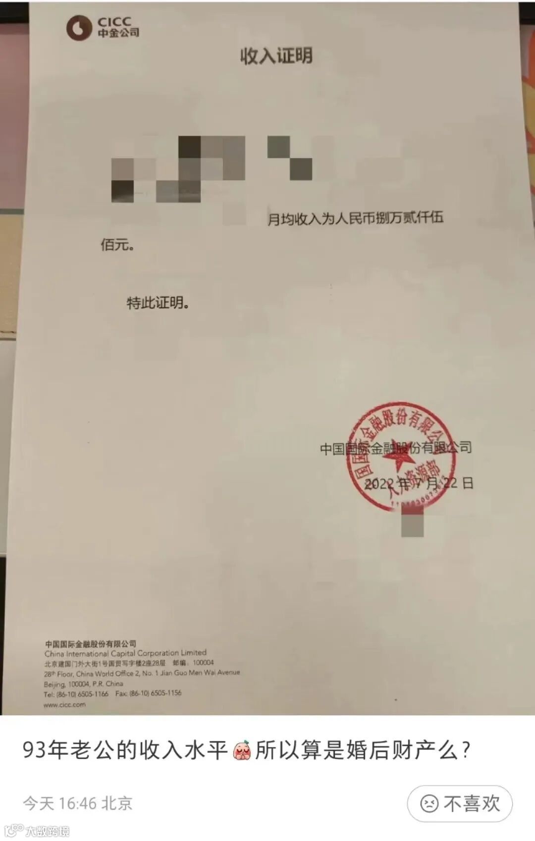 在7月28日,中金公司一名交易员的夫人晒出了其夫的收入证明,该证明显示其月均收入为82500元。这位夫人问:“93年老公的收入水平,所以算婚后财产吗?”