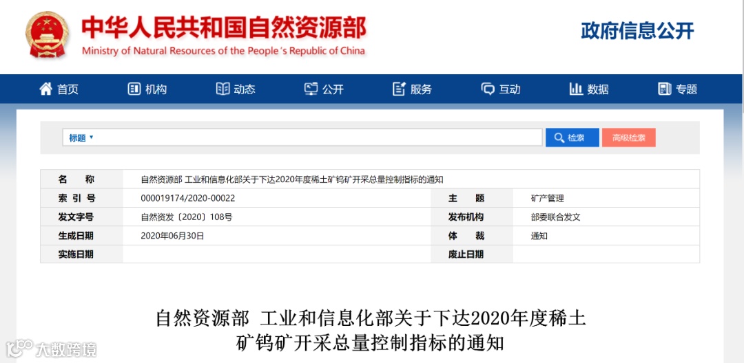 2015年至今,国土部均下发通知,对稀土、矿钨矿开采总量指标进行控制。