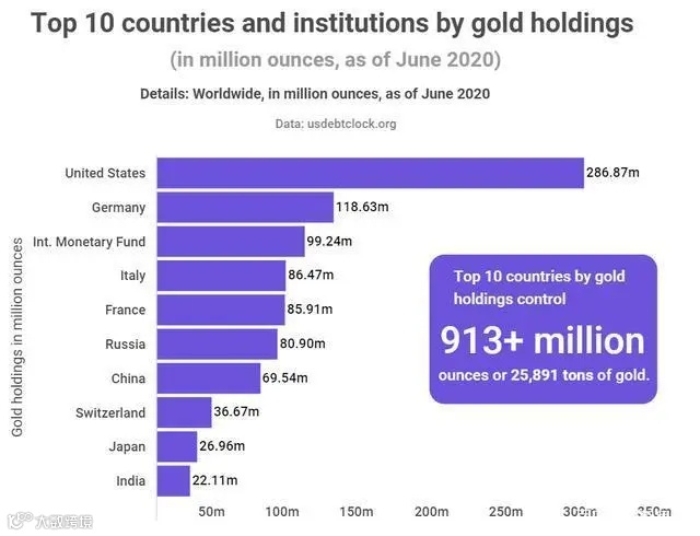 黄金的价值自不用多说。对一个国家来讲,黄金是作为具有无限权威性的储备资产。世界黄金协会发布的数据显示,截至2020年5月,全球官方黄金储备共计34904.76吨,其中,美国占全球黄金储备总量的15.5%,为5410吨,位居全球第一位。