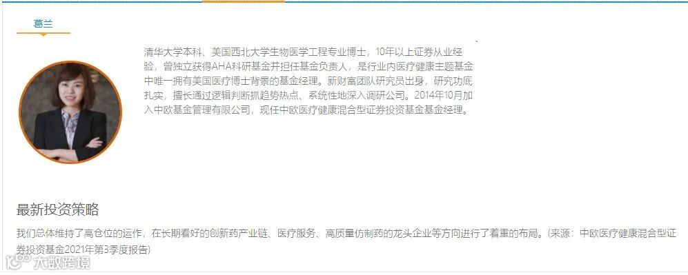 葛兰本科毕业清华大学工程物理系,其后又取得美国西北大学生物医药工程硕士、博士,因中欧医疗健康混合业绩优秀,火出圈,曾被网友称为“医药女神”。