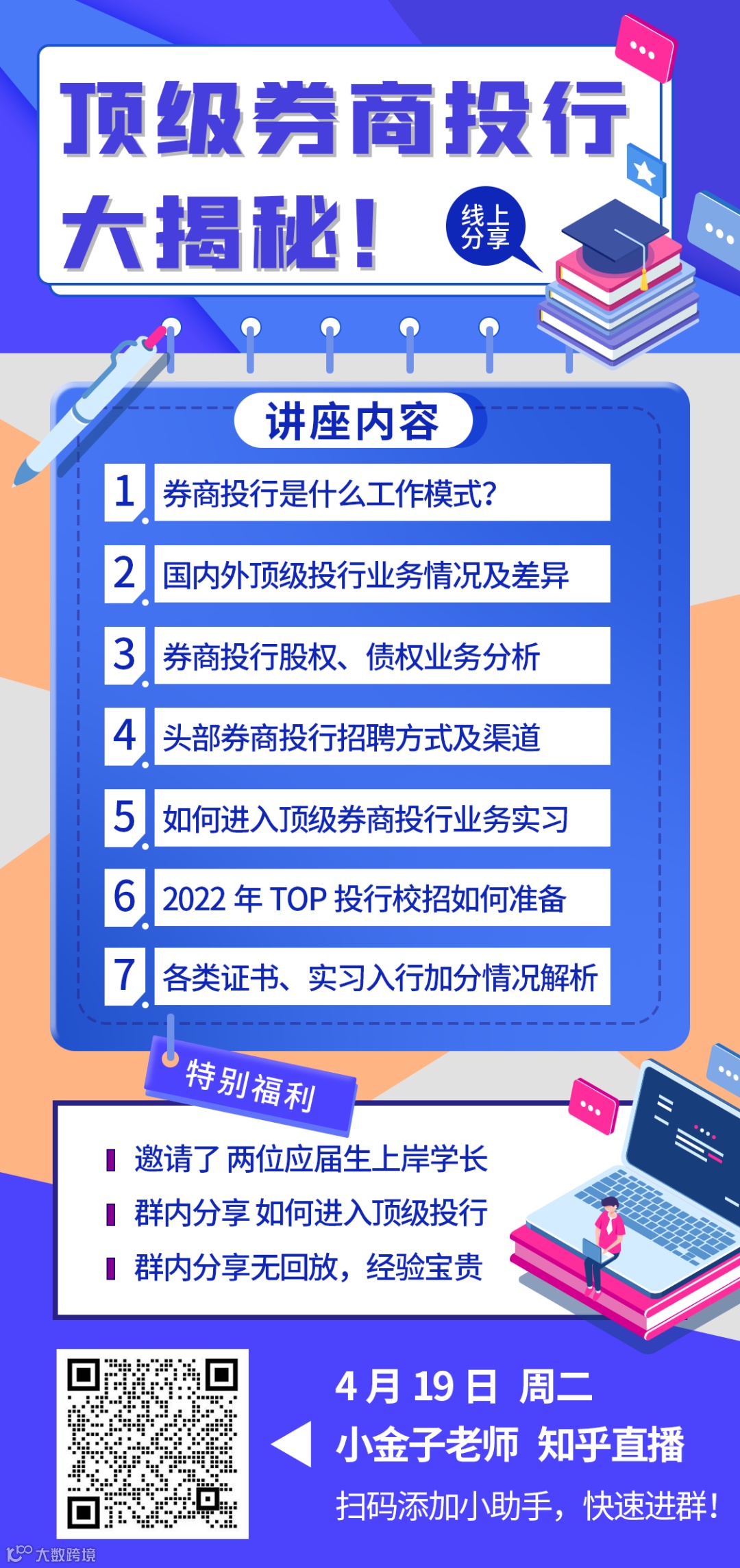 除了努力以外,选对努力的方向也很重要。本次讲座我们将从一个完全的金融小白开始,教你如何卷进投行。想要参与的小伙伴扫描下方二维码加群即可免费参与。