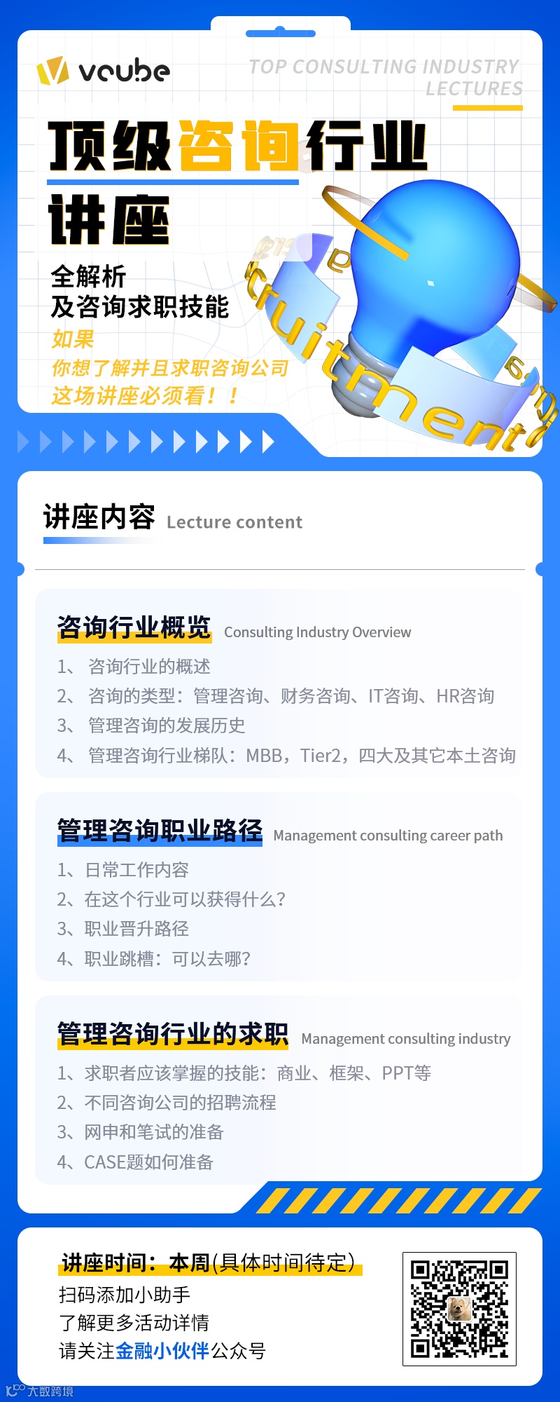 还有Management Consulting管理咨询,管理咨询更偏向于宏观的,重要的战略制定,比如,某公司想进军欧洲市场应该采取什么策略?某公司想在明年提高10%的利润率应该从哪些方面入手?