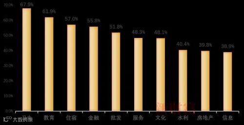 据《中国劳动统计年鉴2020》的数据,在女性就业人员占比TOP10行业中,除了教育、卫生、住宿等传统的女性就业比较密集的行业外,金融业排名高达第四,女性从业者占比达到55.8% 。