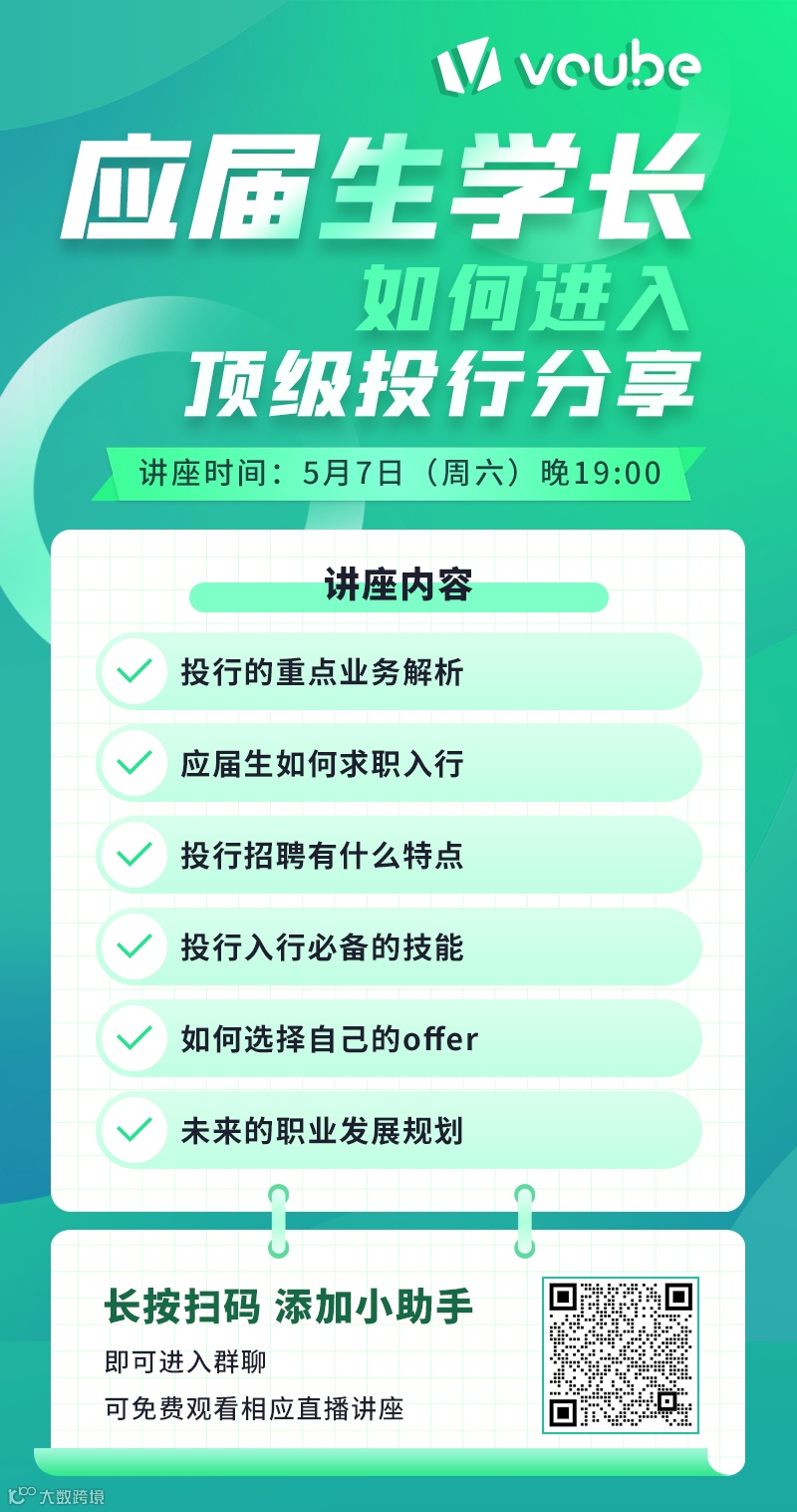 本次讲座我们将请来刚刚入行的学长,给大家分享有关投行工作的最新行业信息。想要参与的小伙伴扫描下方二维码加群即可免费参与。