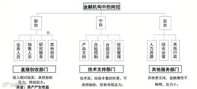 关于金融行业有哪些岗位,相信大家对前台,中台,后台的概念也有所了解。假如我们能明确前中后具体值得是什么的话,当我们说起一个部门,就可以大概了解工作内容及发展方向,这对你之后的选择有很大的帮助。