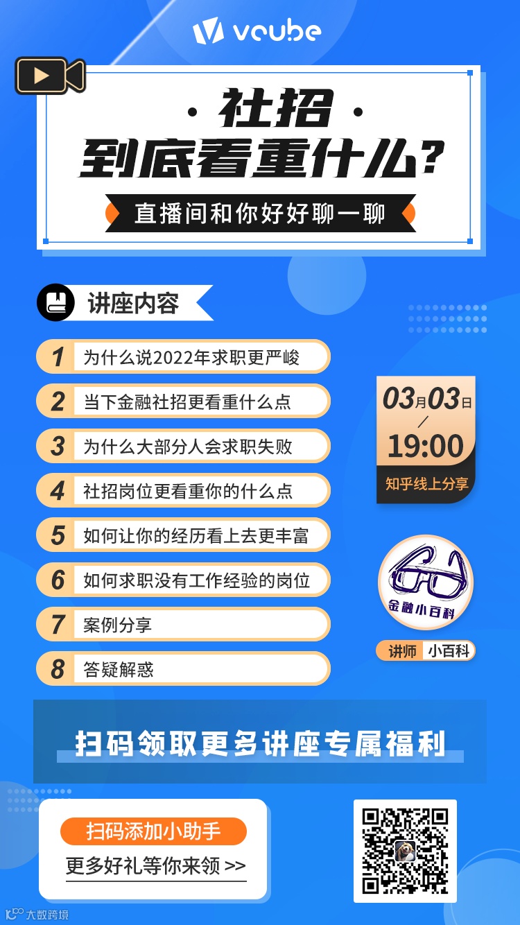 为了解决大家在社招中遇到的问题,金融小伙伴准备了专题讲座,想要参与的伙伴扫描下方二维码免费加群参与。