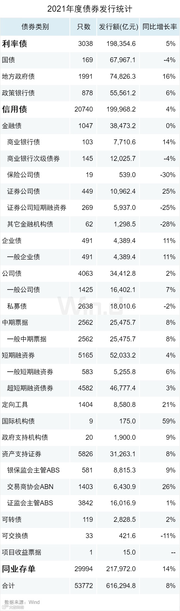 根据Wind统计各类债券发行数据显示,2021年中国内地债券发行较往年增速趋缓,全年各类债券发行合计61.63万亿,同比增长8%。