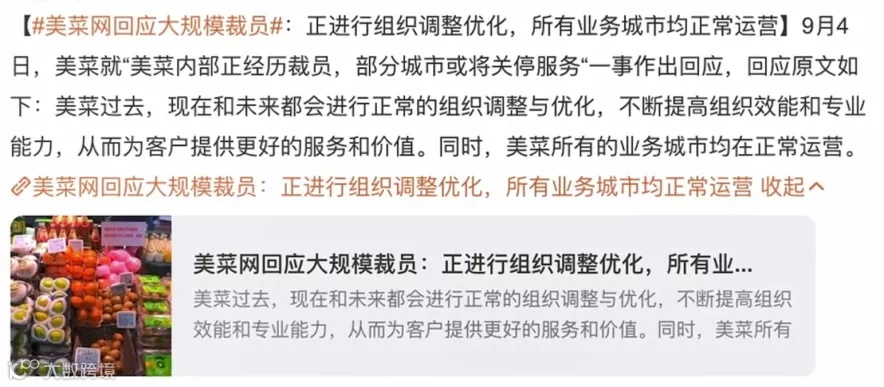 此外,由于市场监管局加强对社区团购低价倾销、价格欺诈等不正当竞争行为监管执法,今年9月,美菜网、滴滴橙心优选分别关闭部分城市服务,并进行大批裁员,比例达50%。