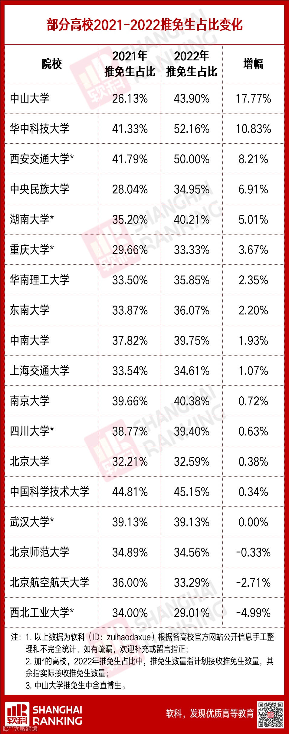 如中山大学、华中科技大学推免占比增幅超过10%,西安交通大学、中央民族大学、湖南大学推免占比增幅超5%。