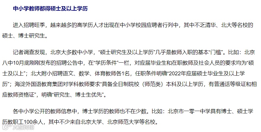 比如,现在中小学教师的学历门槛越来越高,尤其在一线城市,中小学老师的学历要求甚至是硕士起步,其中不乏清华、北大等名校的硕士、博士研究生。