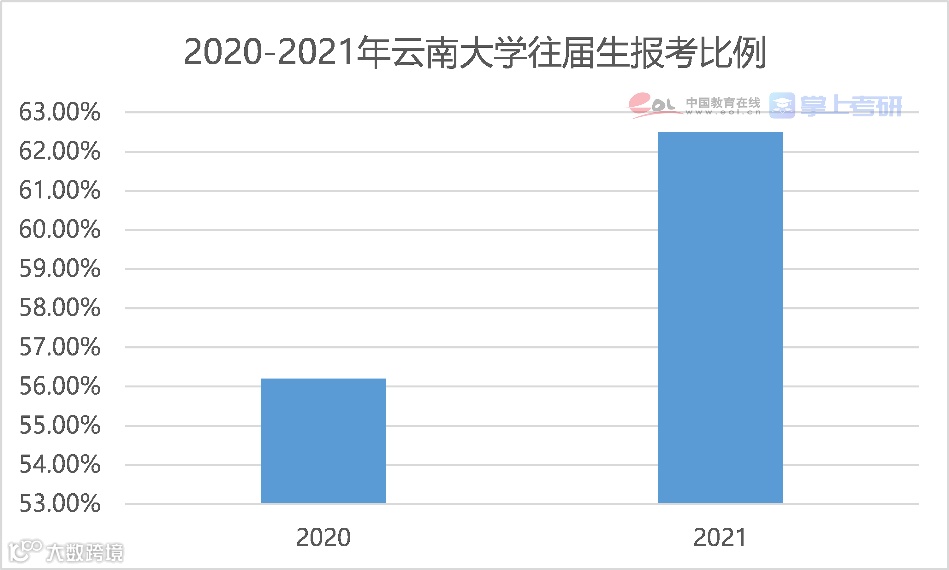 以“双一流”高校云南大学为例。云南大学2020年往届生考研人数为12291人,占比56%,已经超过了总人数的一半;2021年往届生考研人数为15410人,占比63%。