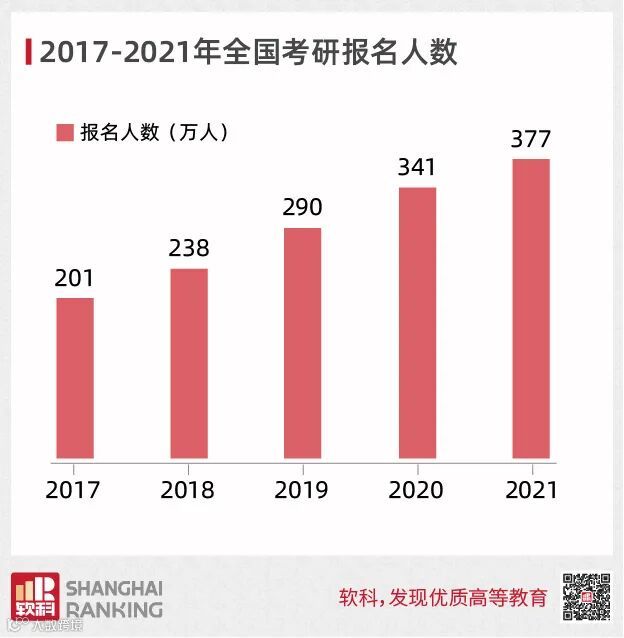近年来,全国考研人数持续增长。根据最近5年的数据,从2017年首破200万大关起,考研报名人数连年攀升,到2021年达到377万。